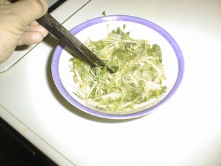 ![]() 先に準備した三ツ葉と卵をよく混ぜ合わせておく。 |