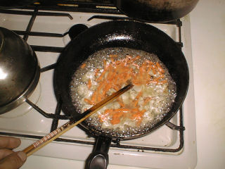 鍋にラードを入れて熱し、煙が立つ直前に魚を入れ、魚が浮き上がったら笊にあげておきます。また、別の鍋に豚肉を入れて炒め、そこに水少々と人参を入れて炒め煮にします。 |