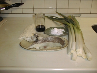 ![]() 魚が煮上がったら身だけを皿にとっておきます。次いで、魚 を煮た煮汁に、葱がひたひたになる程度まで水を加えてから 葱を入れ、軟らかくなるまで煮ます。 |