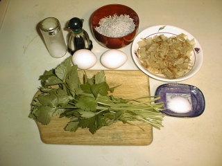 ![]() (写真は二人分の材料です) 材料の準備(一人分)生の白魚(または乾白魚)、40グラム食塩、少量 卵、60グラム 醤油、少量 三ッ葉、10グラム 味の素、少量 削り節(または鰹節)、5グラム 水、300ミリリットル |