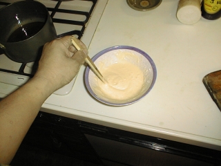 ![]() 麦粉によくかき混ぜた卵を加え、どろどろの衣を作ります。 (注)レシピの卵と小麦粉の分量だと、衣が分厚くなってし まいますので、からりと揚げたい方は、水を加え、ゆるめて ください。衣にねっとり感がない程度でも大丈夫です。また、 衣の中にダマがあっても出来栄えには影響ありません。 |