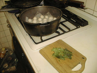 ![]() (写真は四人分の食材です・醤油が抜けています) 材料の準備(一人分)鶏肉(挽肉)、55グラム上しん粉、5グラム 煮出し汁、300ミリリットル 醤油、少量 三ツ葉(またはほうれん草)、30グラム 食塩、少量 味の素、少量 ※注:上しん粉とは、米の粉のこと |