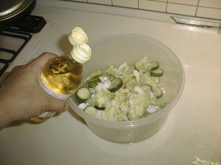 ![]() 胡瓜と玉菜をボールに入れ、食塩をふりかけてから軽く混ぜ、 約20分間ほど置きます(この間、1回静かに混ぜ合わます)。 |