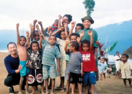 | 14:20 | ナオロ村のはずれにあるゲストハウス着。ゲストハウスはガーデンの中にある。思ったよりまし。老朽化した日本の避難小屋並。高床式のニッパハウスである。30人は収容できよう。便所は裏にあり。ほんのチョイトおどろ。水はハウスの裏の急な斜面(土にステップが切ってある)を下り、谷に降りる。下り5分、登り10分。水場と水浴び場とに分かれている。水浴場は樋で水を引いてあり、水をかぶることが出来る。水量豊富。綺麗だが念の為、飲料水には浄化剤を使用。村はゲストハウスから5分。尾根上にある。昔はふもとの平地にあったが、マラリア蚊をさけるために尾根上に写ったという。SDAの教会(といってもニッパハウスみたいなもの)あたりはお花畑になっていて美しい。須原が村の子供と交歓。鬼ごっこで大いに楽しみ、子供達にパニックをまきちらす。 | ||